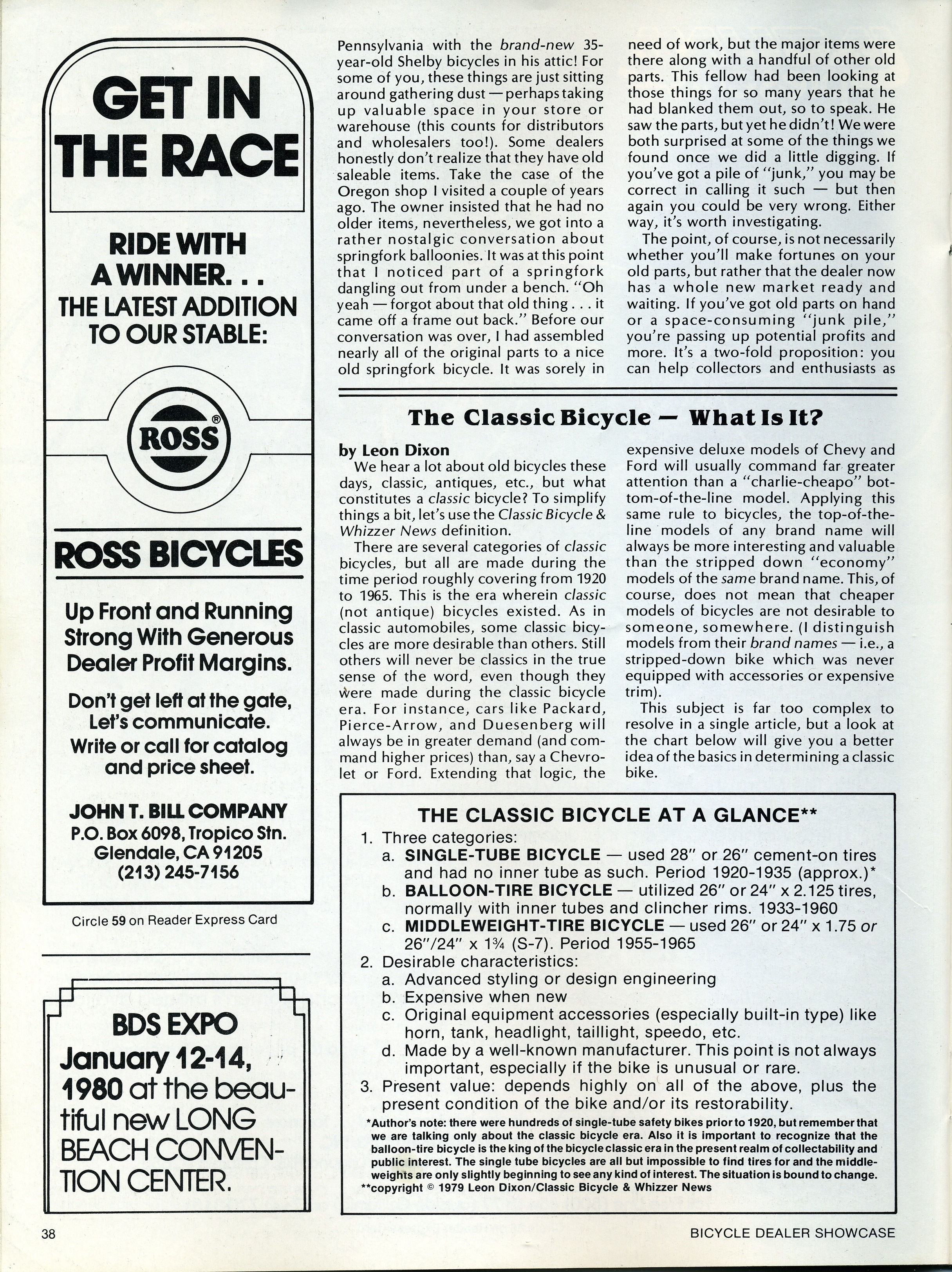 This article, definition and images resulted in a lot of interest from stunned dealers who had no idea they were throwing out valuable bicycles and parts. BDS magazine asked us back each year afterward and our yearly "BICYCLE MUSEUM" put on by Leon Dixon was a hit of the show for many years to come (people today have short memories and even many who were there have now forgotten–but it happened). The first two years, our exhibit drew such a crowd that adjacent exhibitors complained of people standing 3 and 4 deep in the aisle. So? Steve Ready and Herb Wetenkamp along with the magazine's publisher arranged for us to have an even larger space! AND we were even asked to teach a special seminar to bicycle dealers at this BDS-EXPO show. And yes, we even still have the flyers from our appearances at these shows including the very first dealer seminar on vintage collectable bicycles and parts! Who did it? Leon Dixon did it.